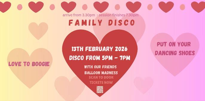 Join us for our next family fun disco & get ready for music, dancing & soft play included in our standard admission price with our friends Balloon MadnessFriday 13th February 2026 : Disco 5 - 7pm